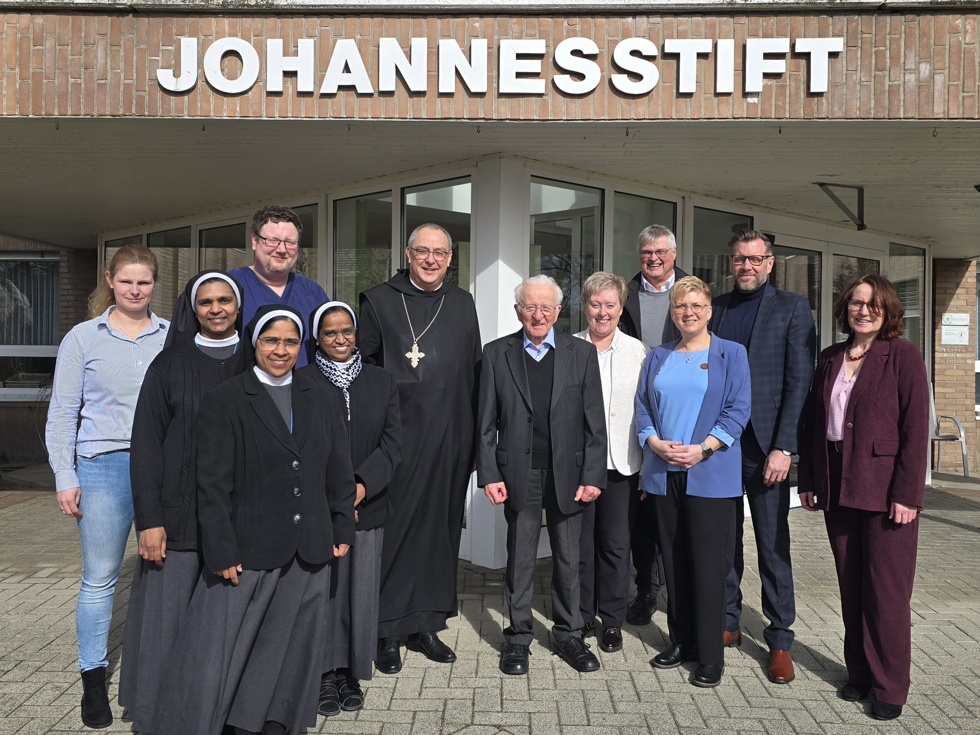 Besuch im Johannesstift Papenburg (v.l.): MAV-Vertreter und Ordensschwestern, Bischof Dominicus, Pater Bernhard Düttmann, Kuratoriumsmitglied der St. Bonifatius Hospitalgesellschaft Mechthild Wessling, Pfarrer und Kuratoriumsvorsitzender der Stiftung Marienhospitel Günter Bültel, Pflegedienstleiterin Ilona Meyer, stv. Geschäftsführer der St. Bonifatius Hospitalgesellschaft Gerd Egbers sowie Heimleiterin Anna Strohschnieder-Tammen.